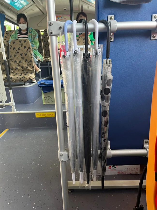 車內(nèi)雨傘、礦泉水、消毒液、消毒濕巾、口罩等一應(yīng)俱全,車身上還懸掛有“高考愛心服務(wù)車 217路為您服務(wù)”等字樣的條幅,這是張玲為了參與愛心助力高考活動(dòng),提前精心布置的車輛。