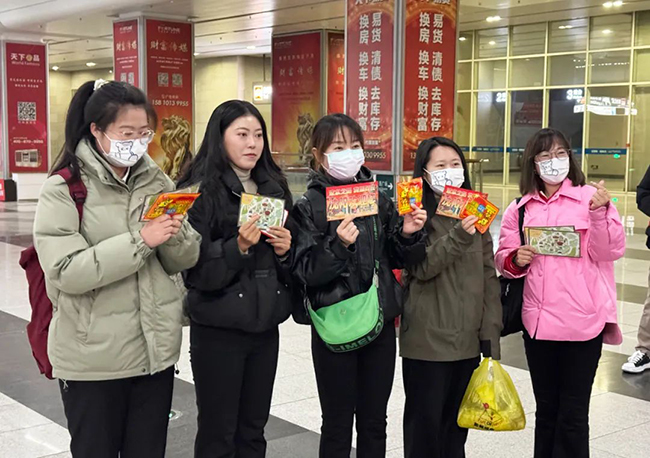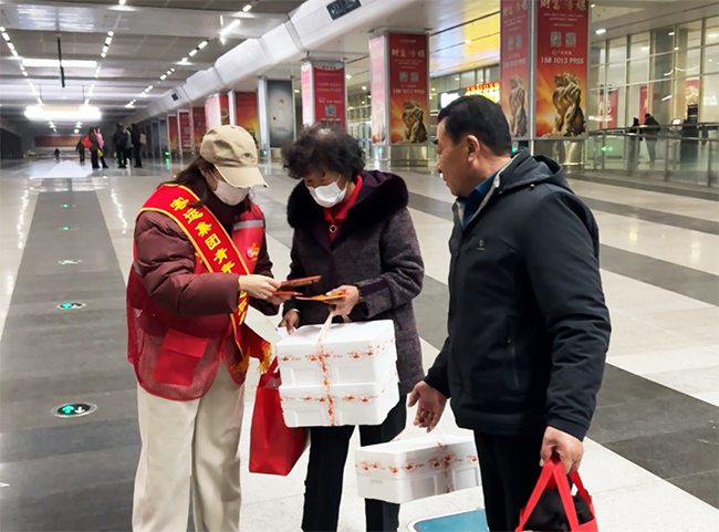 活動(dòng)中,團(tuán)員青年及志愿者在沈陽(yáng)南站出站口、地鐵口及公交樞紐站服務(wù)臺(tái)向廣大乘客發(fā)放“沈陽(yáng)最美網(wǎng)紅打卡地圖”DM傳單及暖寶寶。
