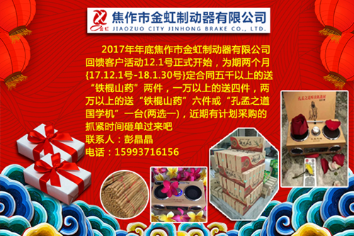 2017年年底焦作市金虹制動(dòng)器有限公司 回饋客戶活動(dòng)12.1號(hào)正式開始為期兩{17.12.1號(hào)-18.1.30號(hào)}定合同五千以上的送“鐵棍山藥”兩件,一萬以上的送四件,兩萬以上的送“鐵棍山藥”六件或“孔孟之道國學(xué)機(jī)”一臺(tái)(兩選一),近期有計(jì)劃采購的抓緊時(shí)間砸單過來吧!